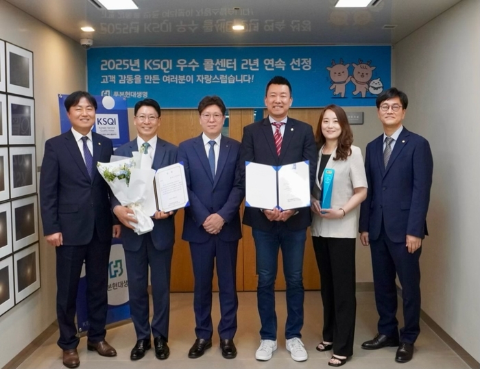 푸본현대생명이 최근 한국능률협회컨설팅(KMAC)이 주관하는 ‘2025년 제22차 한국산업의 서비스품질지수(KSQI)’ 콜센터 부문에서 2년 연속 우수 콜센터로 선정됐다. (왼쪽에서 3번째부터) 오철세 KMAC 상무,이재원 푸본현대생명 이재원 사장. [사진 출처 = 푸본현대생명] 푸본현대생명은 한국능률협회컨설팅(KMAC)이 주관하는 ‘2025년 제22차 한국산업의 서비스품질지수(KSQI)’ 콜센터 부문에서 2년 연속 우수 콜센터로 선정됐다고 5일 밝혔다.