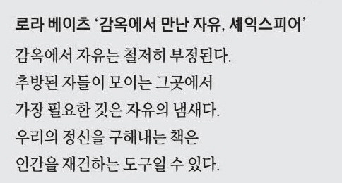 하지만 인디애나주립대 교수인 로라 베이츠의 책 '감옥에서 만난 자유,셰익스피어'는 가장 닫힌 공간에서 오히려 가장 큰 자유를 갈망하는 인간을 조우할 수 있음을 이야기한다.