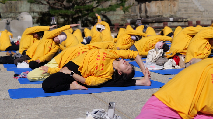 지난 11일 전남 구례군 지리산 화엄사 보제루 앞에서 요가 동호인과 시민,스님 등이 함께 요가를 하고 있다. 이번 행사는 ‘유엔 세계 요가의 날’을 기념해 열린 것으로,지리산의 자연 속에서 명상과 치유를 나누자는 취지로 마련됐다. <화엄사>