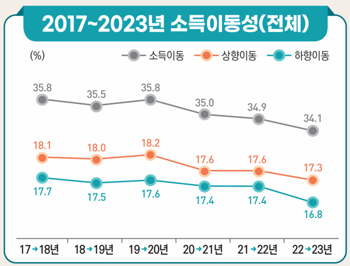 2023년 근로·사업소득 기준 소득 분위의 상승이나 하락을 경험한 비중은 34.1%로,전년(34.9%)보다 0.8%포인트(p) 줄었다. 최 실장은 “소득이동성이 감소했다는 건 전년보다 소득을 유지하고 있는 사람이 좀 더 늘었다는 의미다”라며 “고령화와 저성장이 계속되는 상황에서 소득이동성은 전반적으로 줄어드는 추세”라고 설명했다.