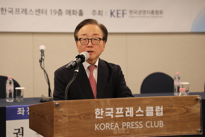 이동근 한국경영자총협회 상근부회장이 29일 서울 중구 프레스센터 열린 일자리 토론회에서 법정 정년 연장에 신중해야 한다는 입장을 밝히고 있다. 한국경영자총협회
