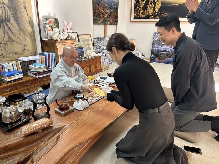 덕운스님은 이어 ‘나는 절로 결혼 1호 커플 탄생 성지 백양사’ 현판을 무공 스님에게 전달했다. 덕운스님 역시 격려 금일봉과 다기세트 등의 선물을 1호 커플에게 전달했다.