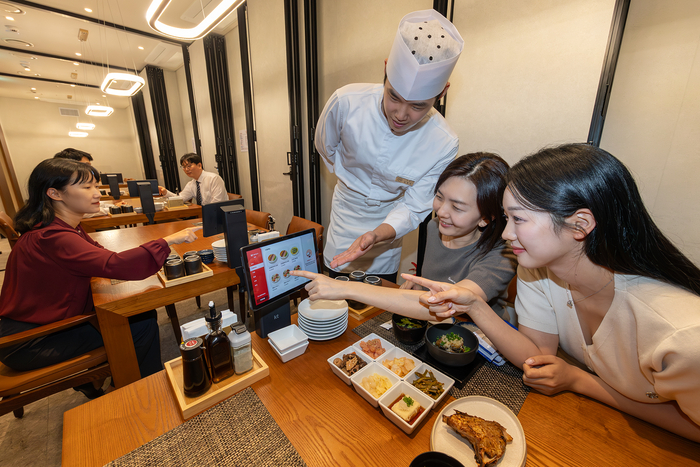 KT 임직원들이 식당에서 KT의 테이블오더 서비스 ‘하이오더’로 주문하고 있다. [사진 = KT] KT가 소상공인들이 매장 운영에 활용할 수 있는 인공지능(AI) 기능을 대거 탑재한 소상공인 플랫폼을 선보였다.
