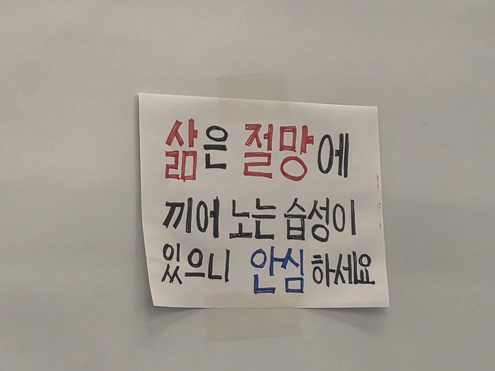 전씨가 마련한 부스에는 “삶은 절망에 끼어 노는 습성이 있으니 안심하세요”라는 문구가 적혀있었다.