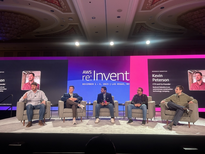 1일(현지시간) 진행된 AWS 리인벤트의 ‘피지컬 AI 트렌드 브리핑’ 현장. 왼쪽부터 아미트 고엘 엔비디아 로보틱스 및 엣지 컴퓨팅 에코시스템 총괄,류중희 리얼월드 대표,스리 엘라프롤루 AWS 이노베이션 센터 디렉터,조쉬 그루엔스타인 튜터 인텔리전스 최고경영자(CEO),케빈 피터슨 베드록 로보틱스 최고기술책임자(CTO). [사진 = 안선제 기자] 한편 리인벤트 행사장에는 피지컬 AI 관련된 여러 글로벌 기업들의 ‘피지컬 AI 쇼케이스’ 부스도 마련돼 많은 관객들의 발길을 끌었다. 이 자리에는 글로벌 로봇 기업인 △딜리전트 로보틱스(Diligent Robotics) △복셀리스(Voxelis) △롭코(RobCo) △루미IT(Roomie IT) △아이젠(Aigen) △코스마(COSMA) 등이 참여했다.