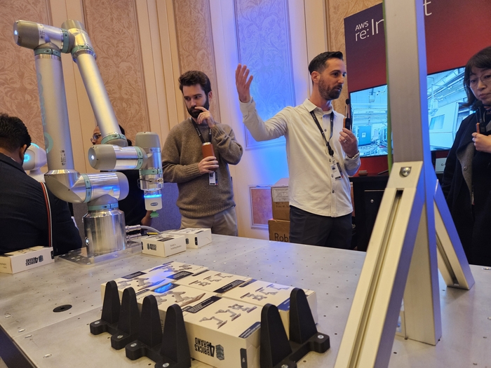 AWS 리인벤트의 ‘피지컬 AI 쇼케이스’에서 롭코가 모듈형 로봇팔 ‘라이트 리오’를 선보였다. [사진 = 아마존웹서비스] [라스베이거스=안선제 기자]