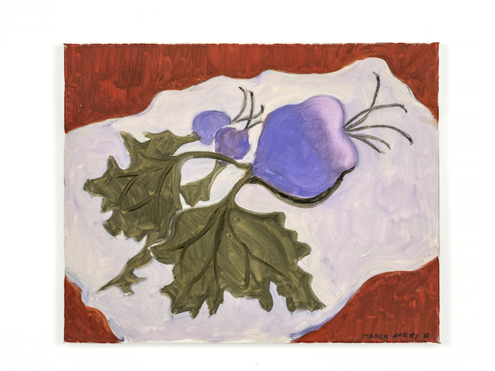 마치 에이버리의 ‘Turnips’(2020) <에스더쉬퍼> 집 안인 사적 공간을 그릴 때 작가의 시선은 더욱 다정해진다. 화려한 정물 대신 식탁 위에 무심하게 놓인 채소를 주목하고,평생을 함께해온 반려묘와 거북이의 평화로운 일상을 응시한다.