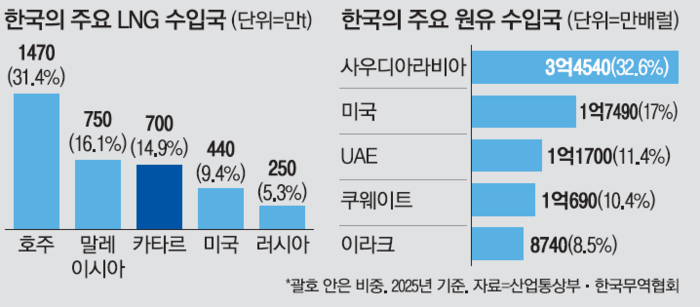한국의 중동산 원유 수입 비중도 70% 정도로 높아 전쟁이 장기화할수록 타격은 클 전망이다. 국내 정유업체 설비상 중동산 원유를 미국산 원유로 대체하기도 어려운 상황이다. 설비가 이미 중동산 중질유에 최적화돼 있어 미국산 경질유에는 적합하지 않기 때문이다.