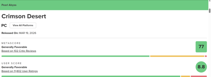 펄어비스 PC버전 메타크리틱 평점. 비평가 평점에서는 77점에 그쳤지만,실제 플레이한 유저 평가는 8.8점을 기록했다. <메타크리틱 웹페이지 캡처> 펄어비스는 붉은사막을 기존 히트작인 검은사막의 뒤를 잇는 회사의 대표 지식재산권(IP)으로 키운다는 목표다. 최근 이뤄진 펄어비스 정기 주주총회에서 허진영 대표는 “(붉은사막 관련) 최고의 목표는 일시적으로 판매되고 끝나는 게임이 아니라 이용자들이 장시간 즐기는 게임을 만드는 것”이라며 지속적인 패치와 함께 확장 게임이나 다운로드콘텐츠(DLC) 등 추가적인 콘텐츠를 내놓겠따는 계획을 밝혔다.